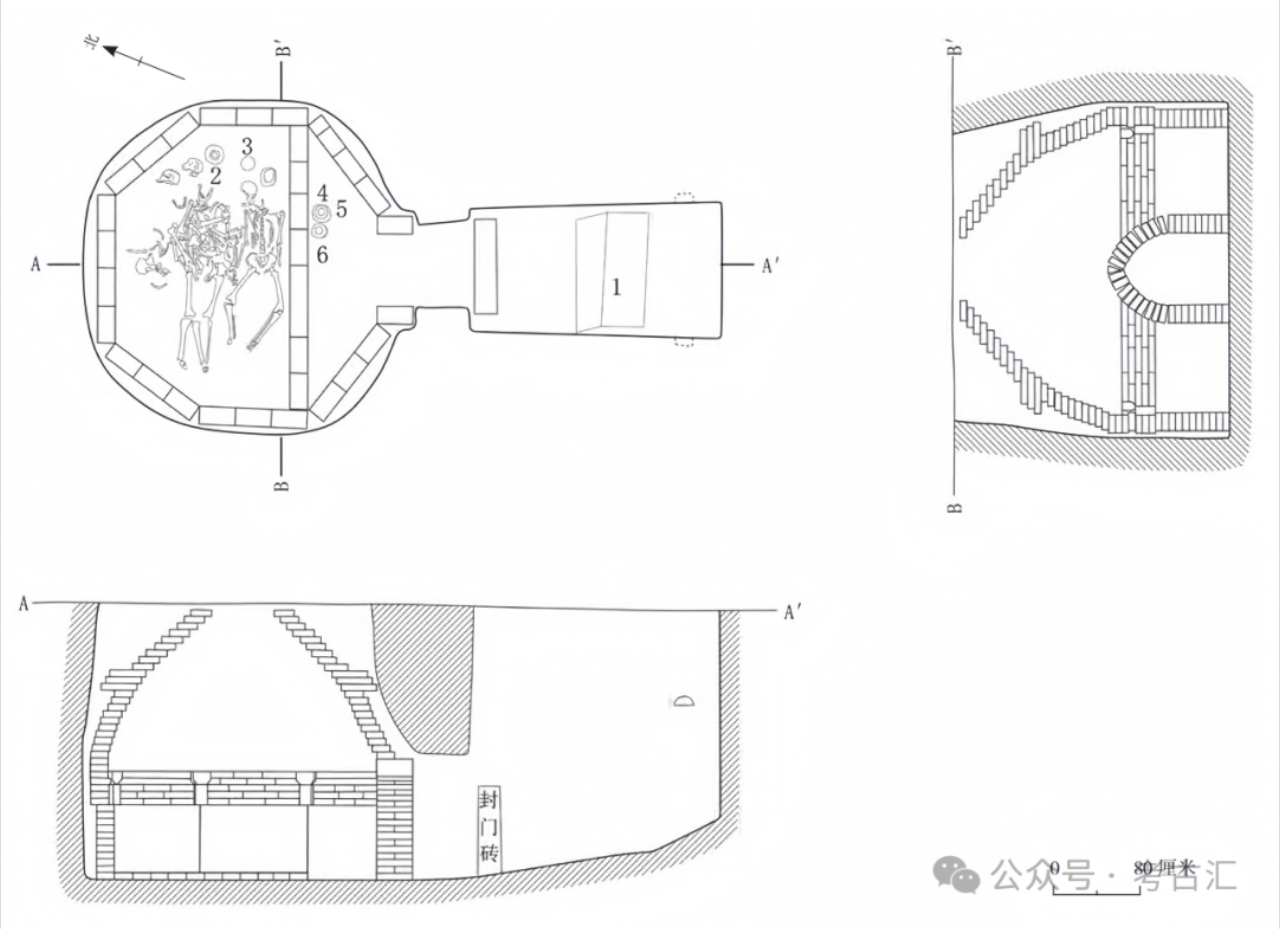 墓葬總體坐北朝南,為八邊形仿木結(jié)構(gòu),有簡(jiǎn)易磚雕構(gòu)件。墓道平面梯形,底部略為斜坡,墓道壁設(shè)腳窩。墓道和墓室之間設(shè)土甬道。封門磚砌筑于甬道口或甬道內(nèi),壘砌較為隨意。墓門單券拱形。墓室壁面寬窄不一。壁面飾簡(jiǎn)易仿木結(jié)構(gòu)磚雕,轉(zhuǎn)角不設(shè)柱,之上為磚砌斗栱等裝飾,再上疊澀砌為穹隆頂。墓底不鋪磚。