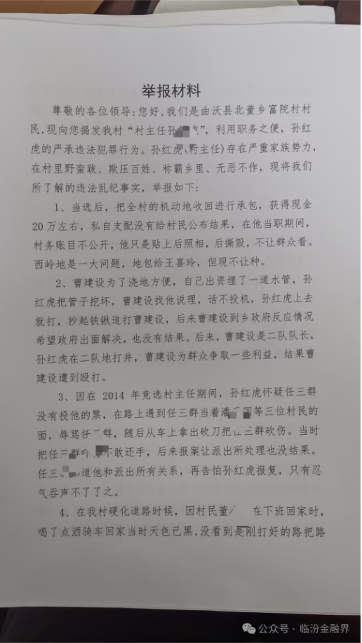 尊敬的各位領(lǐng)導(dǎo):您好,我們是曲沃縣北董鄉(xiāng)窯院村村民,現(xiàn)向您揭發(fā)我村“村主任孫紅虎”,利用職務(wù)之便,孫紅虎的嚴(yán)承違法犯罪行為。孫紅虎(村主任)存在嚴(yán)重家族勢力,在村里野蠻跋、欺壓百姓、稱霸鄉(xiāng)里、無惡不作,現(xiàn)將我們所了解的違法亂紀(jì)事實(shí),舉報如下: