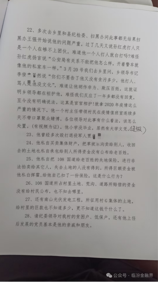 21、鄉(xiāng)政府給景區(qū)每次撥拔草款都有他自行安排去干的弄虛作假謊報人數(shù),望領(lǐng)導(dǎo)組織詳查。22、多次去鄉(xiāng)里和縣紀(jì)檢委、掃黑辦問此事都無結(jié)果掃黑辦王強(qiáng)開始說他的問題嚴(yán)重,過了幾天又說孫紅虎打人只是一個人在夠不上團(tuán)伙,難道他一個人打人就白打嗎?難怪孫紅虎揚(yáng)言說“公安局有關(guān)系不能把他怎么樣,開著警車就像他的私家車一樣?!?月20號我們?nèi)ムl(xiāng)里問,鄉(xiāng)領(lǐng)導(dǎo)書記李俊杰居然說“你們不要告了他又沒有貪污多少,他打人、罵人是他沒文化”,難道讓他胡作非為、欺壓百姓,這就證明鄉(xiāng)領(lǐng)導(dǎo)都在袒護(hù)他,難怪我們反應(yīng)了一年多都沒有回復(fù),至今沒有明確說法。這真是官官相護(hù)!就拿2020年疫情這么嚴(yán)重的情況下,他一個村主任帶領(lǐng)村民在疫情值班室連續(xù)多天不帶口罩聚眾賭博,各位領(lǐng)導(dǎo)對此事有什么看法,該怎么處置。(有視頻為證)。他小學(xué)沒畢業(yè),居然有大學(xué)文憑。假23、他曾經(jīng)多次毆打退役軍人賈東迎。