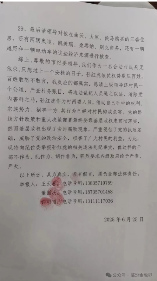 綜上,尊敬的上級領(lǐng)導(dǎo),我們作為一名合法村民別無他求,只想過上一個安穩(wěn)的日子,孫紅虎依仗權(quán)勢欺壓百姓,百姓敢怒不敢言,我反應(yīng)的都屬實(shí),懇請上級領(lǐng)導(dǎo)還村民一個公道,嚴(yán)查村務(wù)賬目,將違法亂紀(jì)人員繩之以法,清除黨內(nèi)害群之馬。