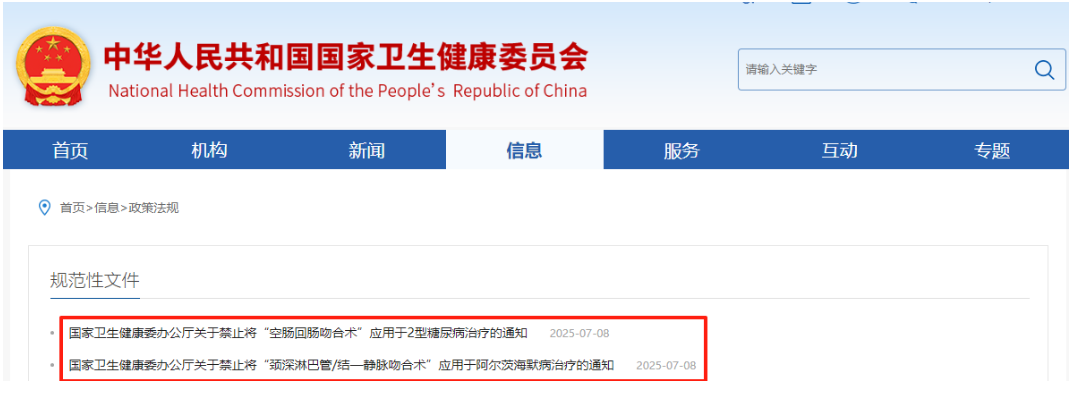 7月8日,國家衛(wèi)健委網(wǎng)站發(fā)布兩則重要通知:《關(guān)于禁止將“頸深淋巴管/結(jié)—靜脈吻合術(shù)”應(yīng)用于阿爾茨海默病治療的通知》《關(guān)于禁止將“空腸回腸吻合術(shù)”應(yīng)用于2型糖尿病治療的通知》。