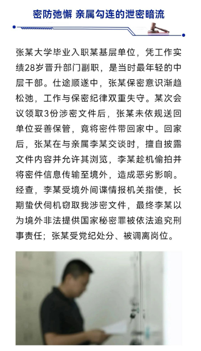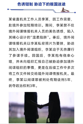 近年來,境外間諜情報(bào)機(jī)關(guān)對我開展?jié)B透竊密活動(dòng)愈發(fā)活躍,他們將我公職人員作為重點(diǎn)圍獵的目標(biāo),精心布局,因人下套。個(gè)別公職人員因立場信念缺失、紀(jì)律觀念弱化、規(guī)矩意識(shí)松懈等原因,引發(fā)失泄密惡果,既折損個(gè)人前程,更對國家安全和利益造成危害。