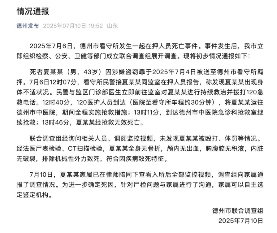 2025年7月6日,德州市看守所發(fā)生一起在押人員死亡事件。事件發(fā)生后,我市立即組織檢察、公安、衛(wèi)健等部門成立聯(lián)合調(diào)查組展開調(diào)查。現(xiàn)將初步情況通報(bào)如下: