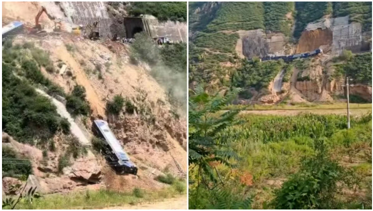 另有畫面顯示,現(xiàn)場多輛工程機械在搶修線路,有機車車體墜落在鐵路線外側(cè)陡坡上。上述工作人員表示,“不把機車部分車體推向外側(cè)陡坡,無法快速搶修鐵路線?!?/span>
