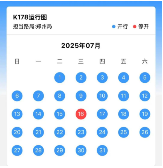7月16日,受內(nèi)地鐵路水害影響,西寧至鄭州的K178次列車停運,具體停運信息請您隨時關(guān)注車站公告或撥打12306咨詢,因列車停運給您出行帶來的不便,請您諒解!