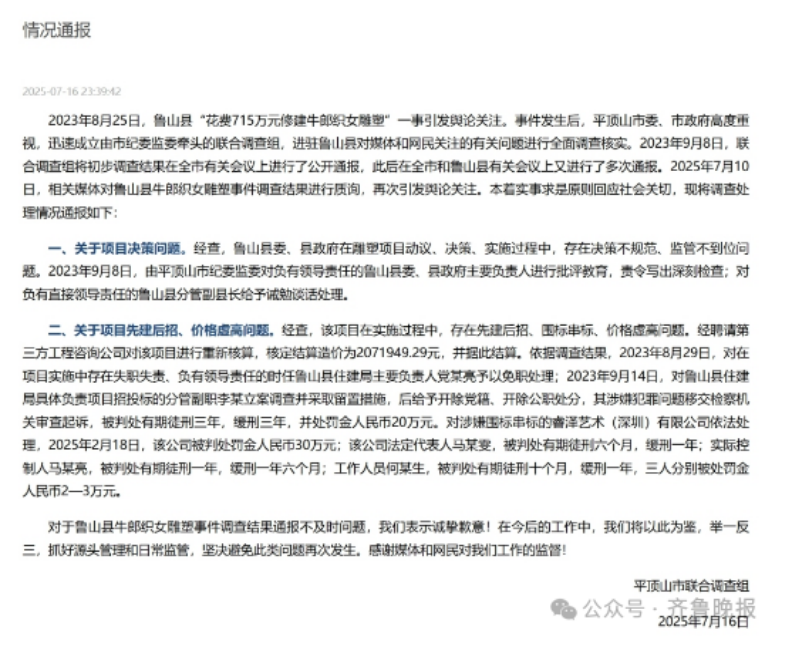 7月16日晚,平頂山市聯(lián)合調(diào)查組再次就“魯山縣花費715萬元修建牛郎織女雕塑”一事發(fā)布情況通報。通報稱,2023年9月8日,由平頂山市紀(jì)委監(jiān)委對負(fù)有領(lǐng)導(dǎo)責(zé)任的魯山縣委、縣政府主要負(fù)責(zé)人進行批評教育,責(zé)令寫出深刻檢查;對負(fù)有直接領(lǐng)導(dǎo)責(zé)任的魯山縣分管副縣長給予誡勉談話處理。2025年2月18日,與事件相關(guān)多人已獲刑。