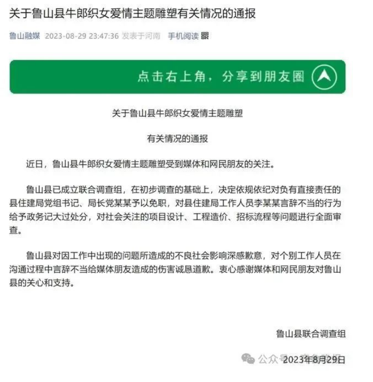 2023年8月31日,平頂山市發(fā)布官微消息,平頂山市聯(lián)合調(diào)查組通報,就廣大群眾關(guān)注的魯山縣牛郎織女愛情主題雕塑一事,平頂山市委、市政府已成立由住建、財政、審計、紀(jì)委監(jiān)委等部門組成的聯(lián)合調(diào)查組開展深入、全面的調(diào)查審查工作,調(diào)查結(jié)果將及時向社會公布。