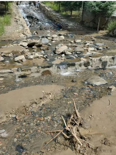 該條山溝匯水面積達6.5 平方公里,平均海拔2200米,常有區(qū)域性大暴雨,溝內(nèi)植被完全被破壞,到處是丟棄的礦渣、沙石,每到汛期洪水?dāng)y帶肉眼可見的泥石沖向下游,這些山洪經(jīng)滴水崖溝,排入永興河, 最后沉積在觀上水庫。