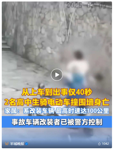 陶女士稱,當(dāng)天兒子同學(xué)的電動(dòng)兩輪車剛改裝好,幾個(gè)同學(xué)去試乘車,她兒子剛坐上車的后座40秒就發(fā)生事故,兒子被甩墻上當(dāng)場身亡,騎車同學(xué)送醫(yī)搶救無效死亡。