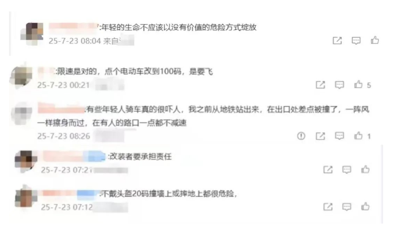 這些事故的發(fā)生不僅給他們背后的家庭帶來了巨大打擊,更引發(fā)了社會(huì)對(duì)未成年人交通安全的深刻反思。許多網(wǎng)友表示痛惜,強(qiáng)烈呼吁改裝者必須承擔(dān)相應(yīng)責(zé)任;還有網(wǎng)友坦言,自己身邊也曾目睹電動(dòng)車超速行駛的危險(xiǎn)場(chǎng)景,對(duì)這類隱患表示擔(dān)憂。