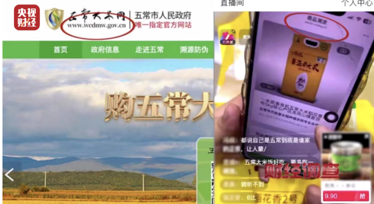 不僅如此,直播間還售賣“一米距離”牌五常大米,主播現(xiàn)場(chǎng)展示掃描產(chǎn)品的溯源網(wǎng)站,實(shí)際打開的卻并非五常市人民政府指定的五常大米網(wǎng)。