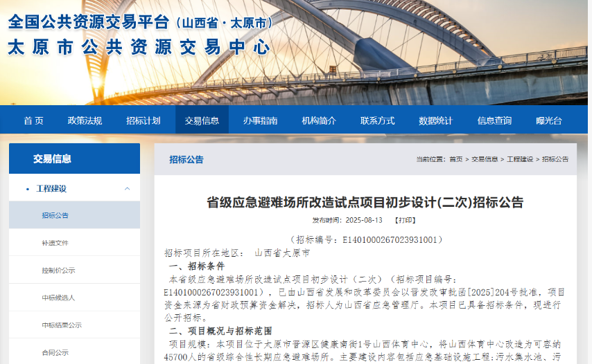 8月13日,山西應(yīng)急管理廳在全國公共資源交易平臺(tái)發(fā)布招標(biāo)公告:山西省級應(yīng)急避難場所改造試點(diǎn)項(xiàng)目初步設(shè)計(jì)(二次)招標(biāo)。