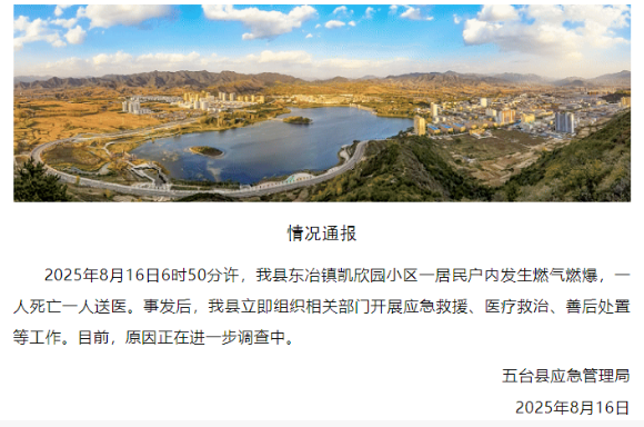 2025年8月16日6時(shí)50分許,我縣東冶鎮(zhèn)凱欣園小區(qū)一居民戶內(nèi)發(fā)生燃?xì)馊急?,一人死亡一人送醫(yī)。事發(fā)后,我縣立即組織相關(guān)部門開展應(yīng)急救援、醫(yī)療救治、善后處置等工作。目前,原因正在進(jìn)一步調(diào)查中。