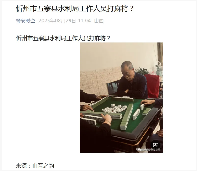近日網(wǎng)傳忻州市五寨縣水利局工作人員打麻將,到底是上班時(shí)間打麻將還是下班時(shí)間娛樂,還是在賭博,請(qǐng)相關(guān)部門能出來說兩句為網(wǎng)民解惑!