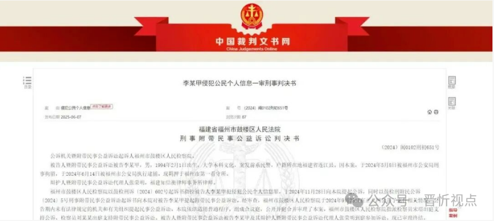 9月5日,大河報《看見》記者從中國裁判文書網(wǎng)獲悉,福建省福州市鼓樓區(qū)人民法院近日公布了該案的刑事附帶民事公益訴訟判決書,判決李某甲犯侵犯公民個人信息罪,判處有期徒刑一年八個月,并處罰金人民幣五萬元;沒收違法所得;責令其在國家級新聞媒體上向社會公眾公開賠禮道歉等。