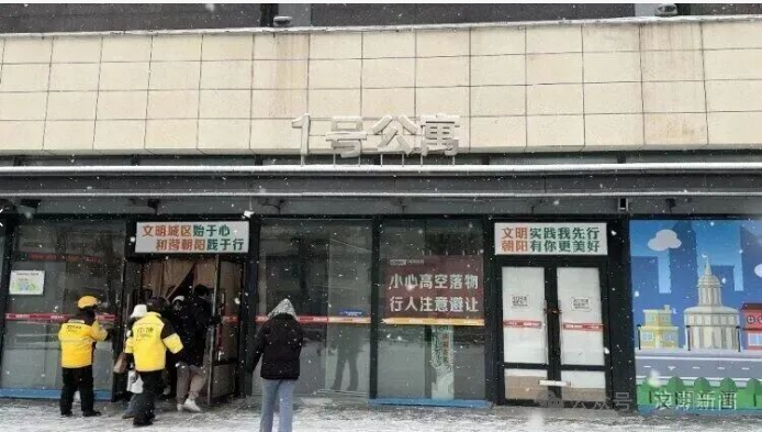2023年11月27日,事發(fā)公寓樓入口張貼著“小心高空落物”標(biāo)識。攝影/上游新聞記者 張瑩