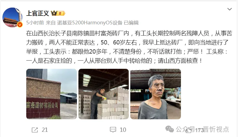 在山西長治長子縣南陳鎮(zhèn)苗村富堯磚廠內(nèi),有工頭長期控制兩名殘障人員,從事苦力搬磚,兩人不能正常表達(dá),50、60歲左右,我早上抵達(dá)磚廠,即向當(dāng)?shù)剡M(jìn)行了舉報,工頭表示:都跟他20多年,不清楚身份,不聽話就打他;嚴(yán)懲! 工頭稱:一人是石家莊撿的,一人從邢臺別人手中轉(zhuǎn)給他的;請山西方面核查!