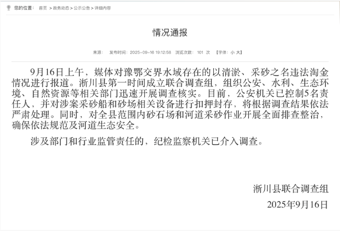 9月16日上午,媒體對(duì)豫鄂交界水域存在的以清淤、采砂之名違法淘金情況進(jìn)行報(bào)道。淅川縣第一時(shí)間成立聯(lián)合調(diào)查組,組織公安、水利、生態(tài)環(huán)境、自然資源等相關(guān)部門迅速開展調(diào)查核實(shí)。