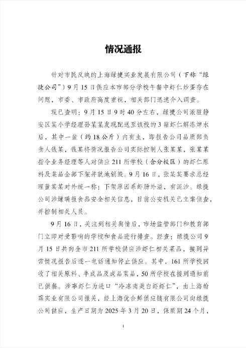 今日(23日),針對(duì)市民反映的上海市部分學(xué)校午餐中蝦仁炒蛋存在問題一事,上海市公安局、上海市市場(chǎng)監(jiān)督管理局、上海市教育委員會(huì)發(fā)布情況通報(bào)。涉事企業(yè)綠捷公司涉嫌瞞報(bào)食品安全相關(guān)信息,目前公安機(jī)關(guān)已立案?jìng)刹椋⒖刂葡嚓P(guān)人員。