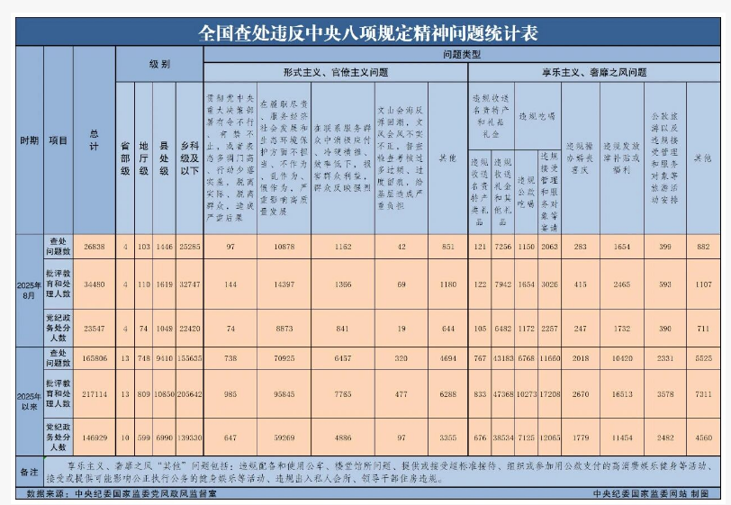 9月25日,中央紀(jì)委國(guó)家監(jiān)委公布了2025年8月全國(guó)查處違反中央八項(xiàng)規(guī)定精神問(wèn)題匯總情況。當(dāng)月,全國(guó)共查處違反中央八項(xiàng)規(guī)定精神問(wèn)題26838起,批評(píng)教育和處理34480人,其中黨紀(jì)政務(wù)處分23547人,這是連續(xù)第144個(gè)月公布月報(bào)數(shù)據(jù)。