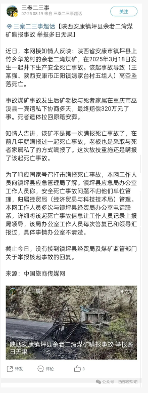 知情人告講,該礦不是第一次瞞報(bào)死亡事故了,在前幾年就瞞報(bào)過(guò)一起死亡事故,老板也是采取與死者家屬私了的方式瞞報(bào)了。這次故技重施還是瞞報(bào)了該起死亡事故。