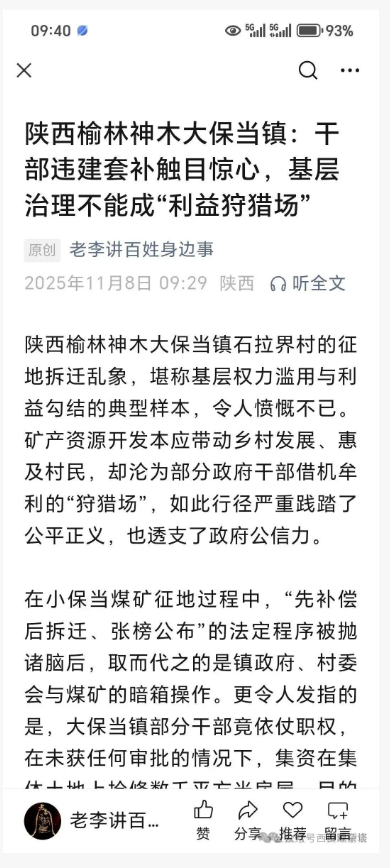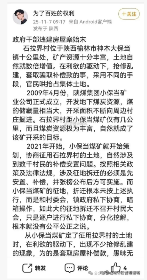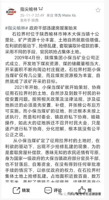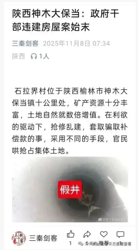 期待上級紀(jì)檢監(jiān)察、自然資源、綜合執(zhí)法等部門迅速介入,以零容忍態(tài)度徹查此事:查清違建房屋的審批漏洞、干部集資的利益鏈條,核實假井套補的具體情況,對涉案公職人員依規(guī)依紀(jì)依法嚴肅追責(zé),全額追繳非法所得。同時要完善征地拆遷公示、監(jiān)管機制,讓權(quán)力在陽光下運行,真正守護好集體利益和村民的合法權(quán)益,還石拉界村一片清朗的治理環(huán)境。@榆林紀(jì)委監(jiān)委@榆林自然資源局@榆林城市管理執(zhí)法局@神木發(fā)布@神木紀(jì)委監(jiān)委@神木自然資源局@神木城市管理執(zhí)法局@神木融媒體中心@神木宣傳關(guān)注。