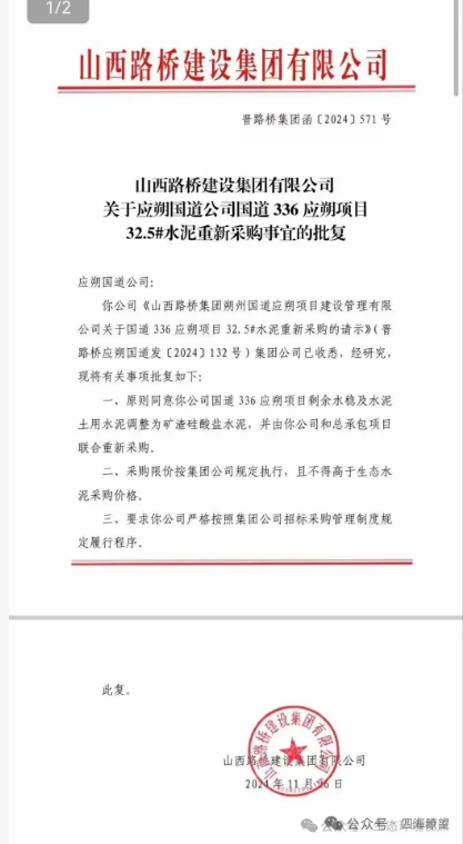 山西路橋集團(tuán)公司黨委會經(jīng)過研究,于2024年11月26日印發(fā)了《關(guān)于應(yīng)朔國道公司國道336應(yīng)朔項(xiàng)目32.5#水泥重新采購事宜的批復(fù)》。