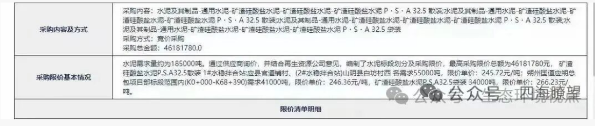山西路橋集團(tuán)成本控制中心在2025年2月28日對第二次招標(biāo)限價(jià)審批表顯示,本次礦渣硅酸鹽水泥采購金額合計(jì)4618.18萬元,限價(jià)含材料費(fèi)、運(yùn)輸費(fèi)、裝卸費(fèi)等。