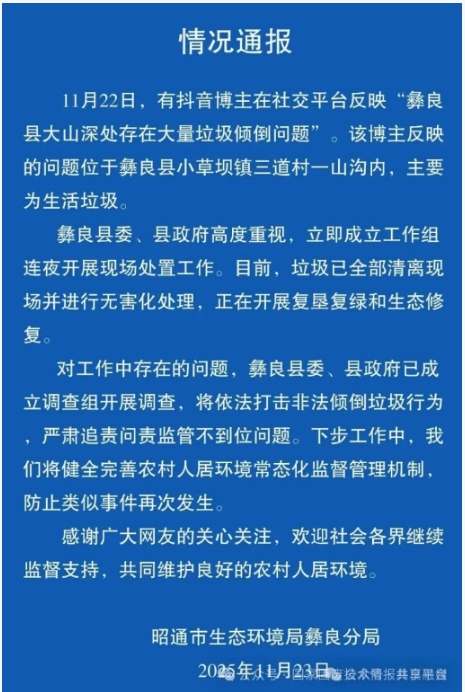11月23日,云南昭通市生態(tài)環(huán)境局彝良分局通報(bào):11月22日,有博主在社交平臺(tái)反映“彝良縣大山深處存在大量垃圾傾倒問(wèn)題”。該博主反映的問(wèn)題位于彝良縣小草壩鎮(zhèn)三道村一山溝內(nèi),被隨意傾倒上百噸生活垃圾,引發(fā)廣泛關(guān)注和熱議。