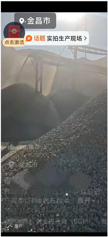 甘肅省金昌市輝峰砂石廠,廠區(qū)內(nèi)缺少必要的防護(hù)措施大量原料露天堆放,露天作業(yè),距離居民區(qū)很近,揚(yáng)塵污染難控制。