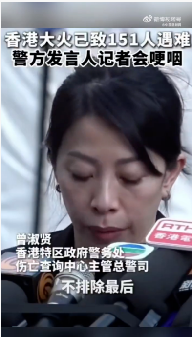 警務(wù)處傷亡查詢中心主管曾淑賢總警司通報(bào),截至當(dāng)天下午4時(shí),火災(zāi)已造成151人遇難,現(xiàn)場(chǎng)所尋獲的所有遺體或未必完整的部分,都會(huì)制作相片方便親友辨認(rèn)。目前已辨認(rèn)出104具遺體,39具尚待辨認(rèn)。仍然有30多個(gè)失聯(lián)的案例。